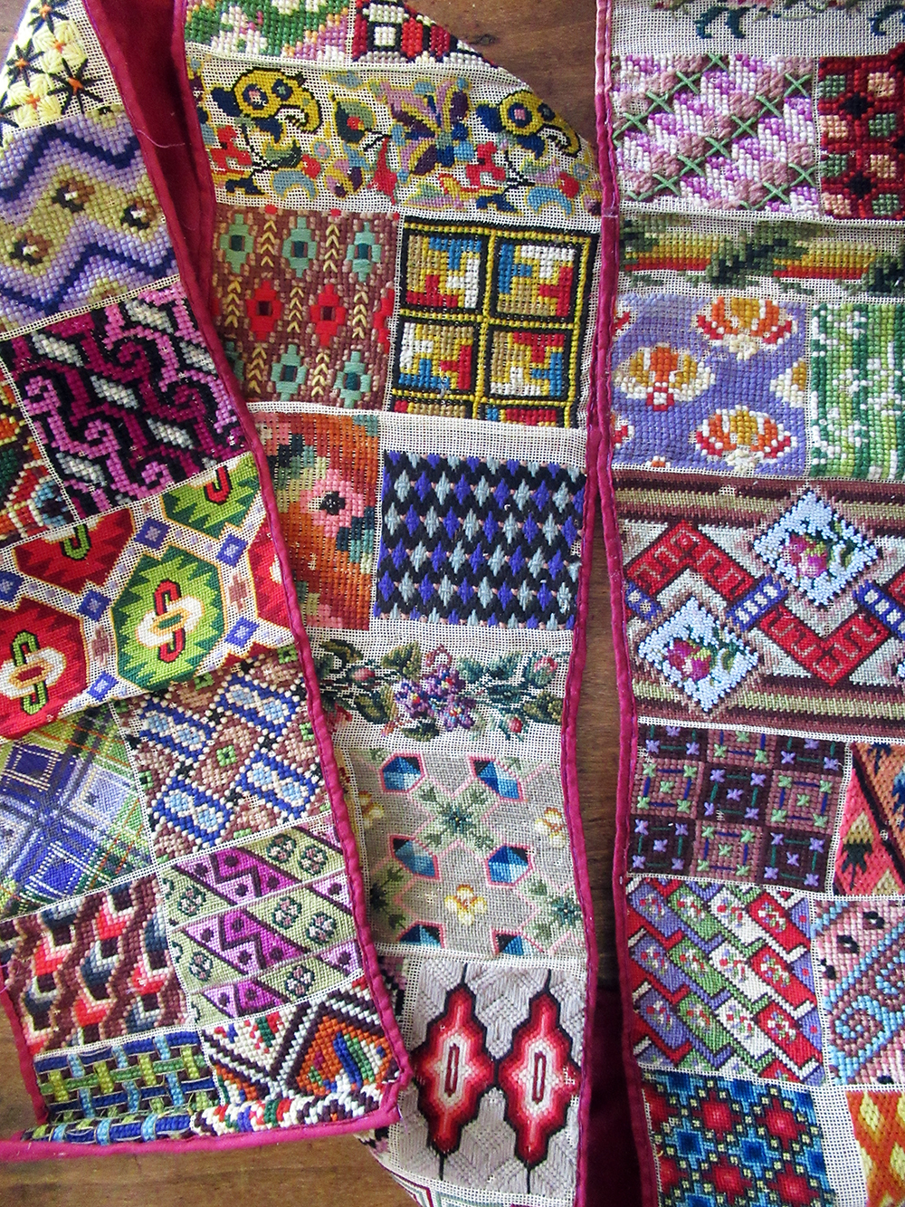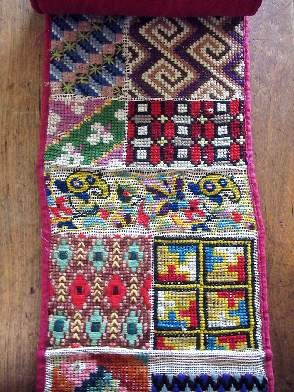 Remarkably vibrant 19th century Berlin Work collection of stitches and needlepoint patterns on a 6+ foot long roll of canvas! Worked with wool and silk threads with accents of metallic thread on fine cotton canvas with about 15 threads per inch. It includes colorful examples of Bargello patterns, classic Berlin Work charted geometrics, textured stitches and portions are solidly stitched with glass beads.