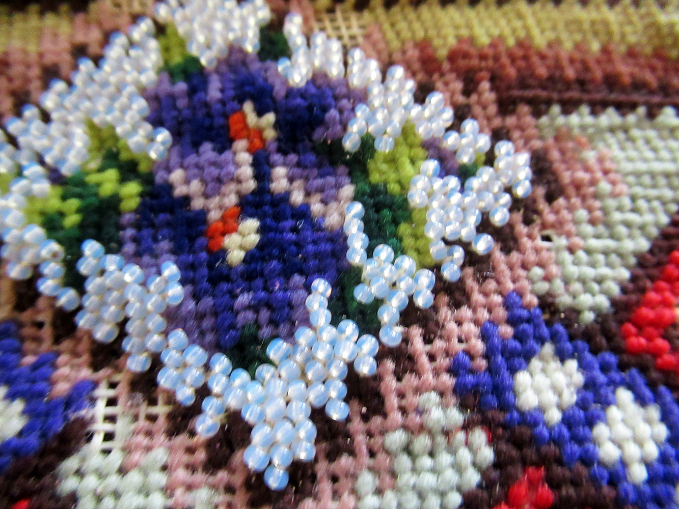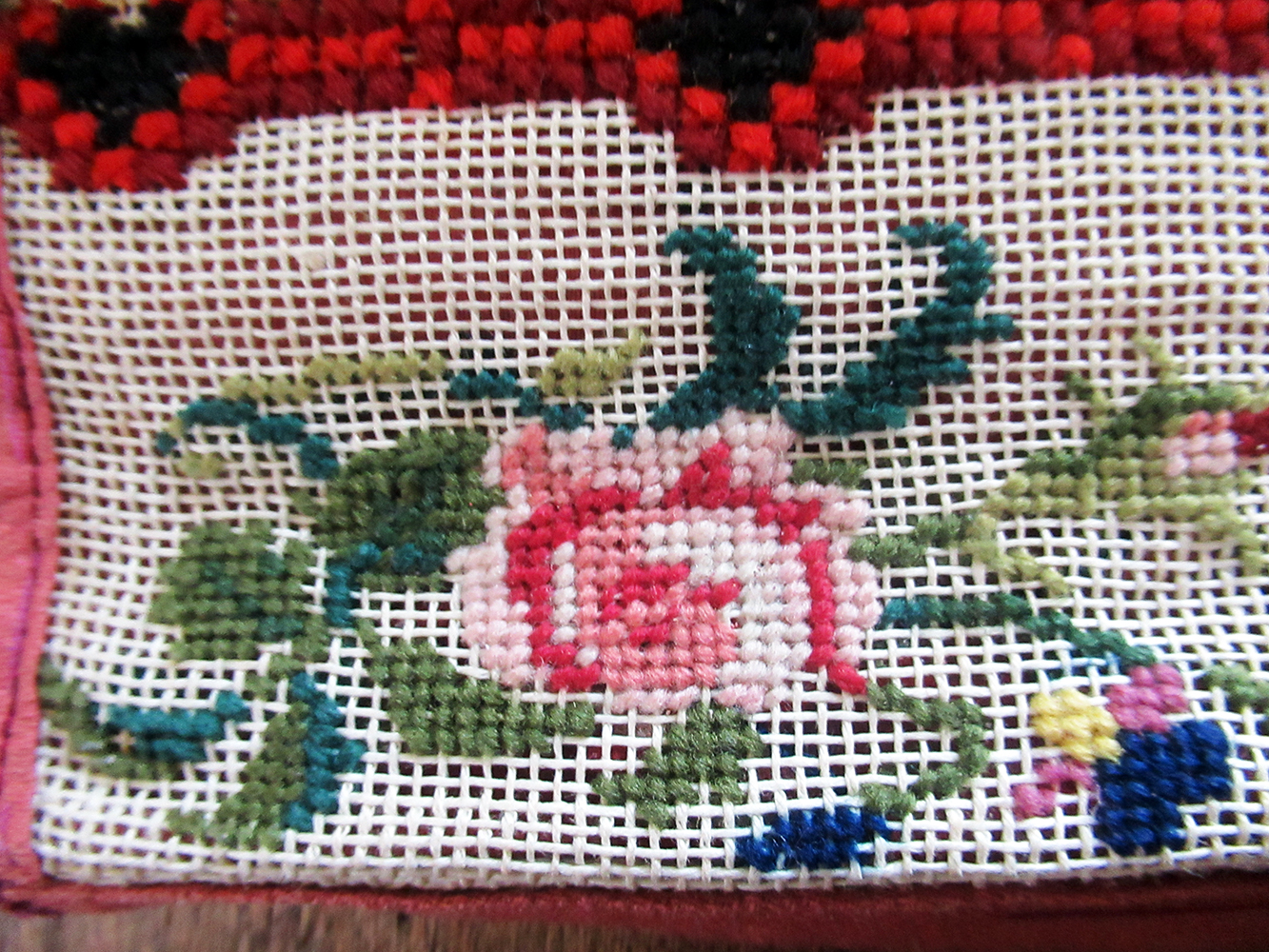 Excellent condition overall, color retention is very good. Some small spots of loss to wool stitches, canvas and fabric backing are very sturdy.