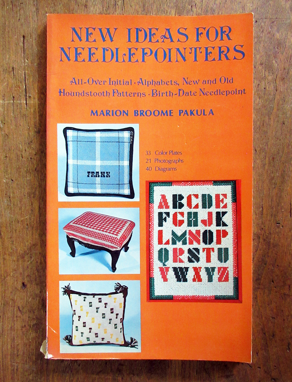 1976 softcover book New Ideas for Needlepointers by Marion Broome Pakula. 95 pages with 33 color plates 21 photos plus 40 diagrams. Nice collection of medium-to-large alphabet charts and plaids.