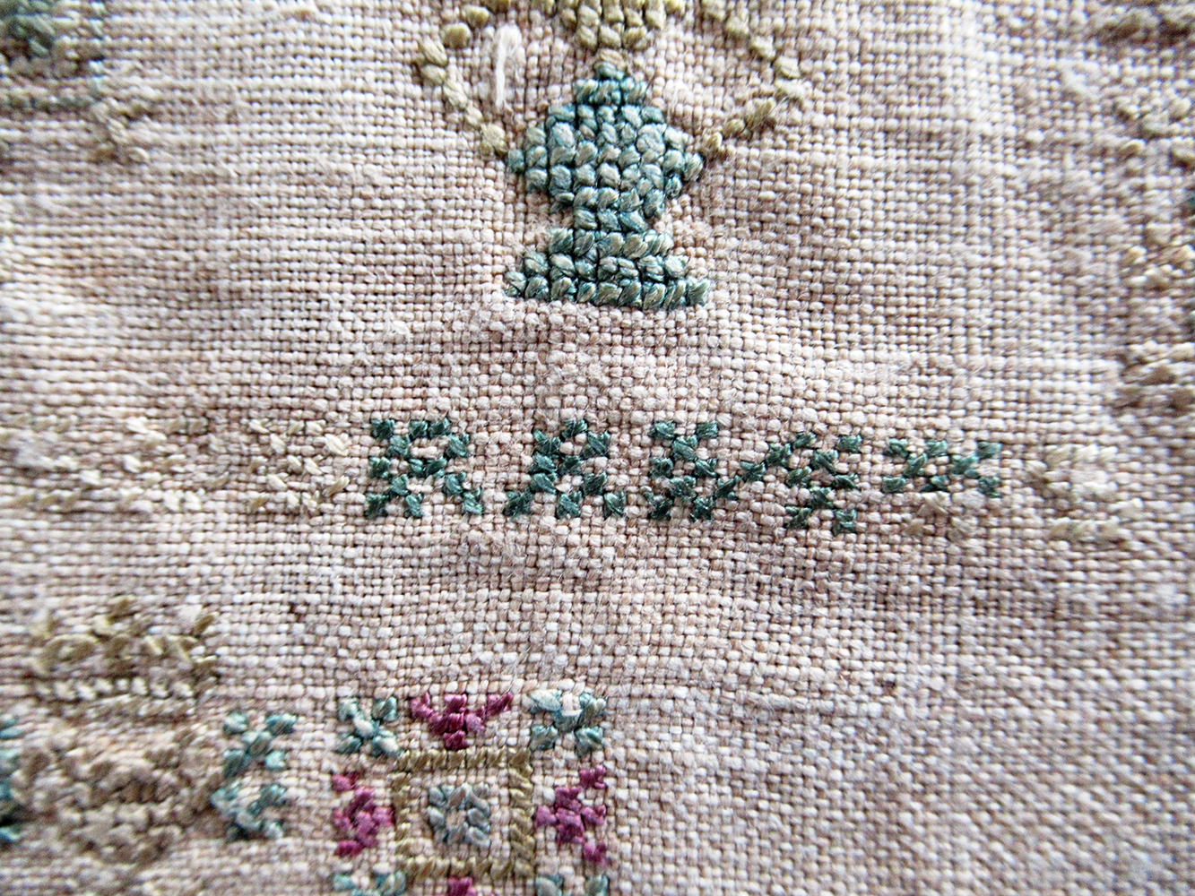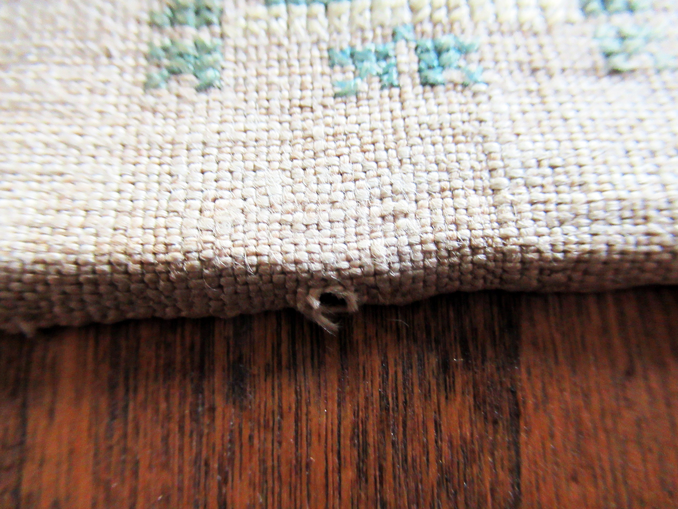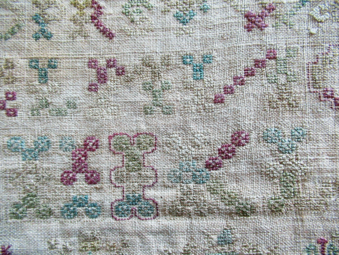 Fine silk thread stitches on very fine linen fabric; good color retention in the silk threads especially the raspberry-red and pretty blue-green shades. The linen threads are also quite fine but in the closeup photos you can see the homespun woven texture.