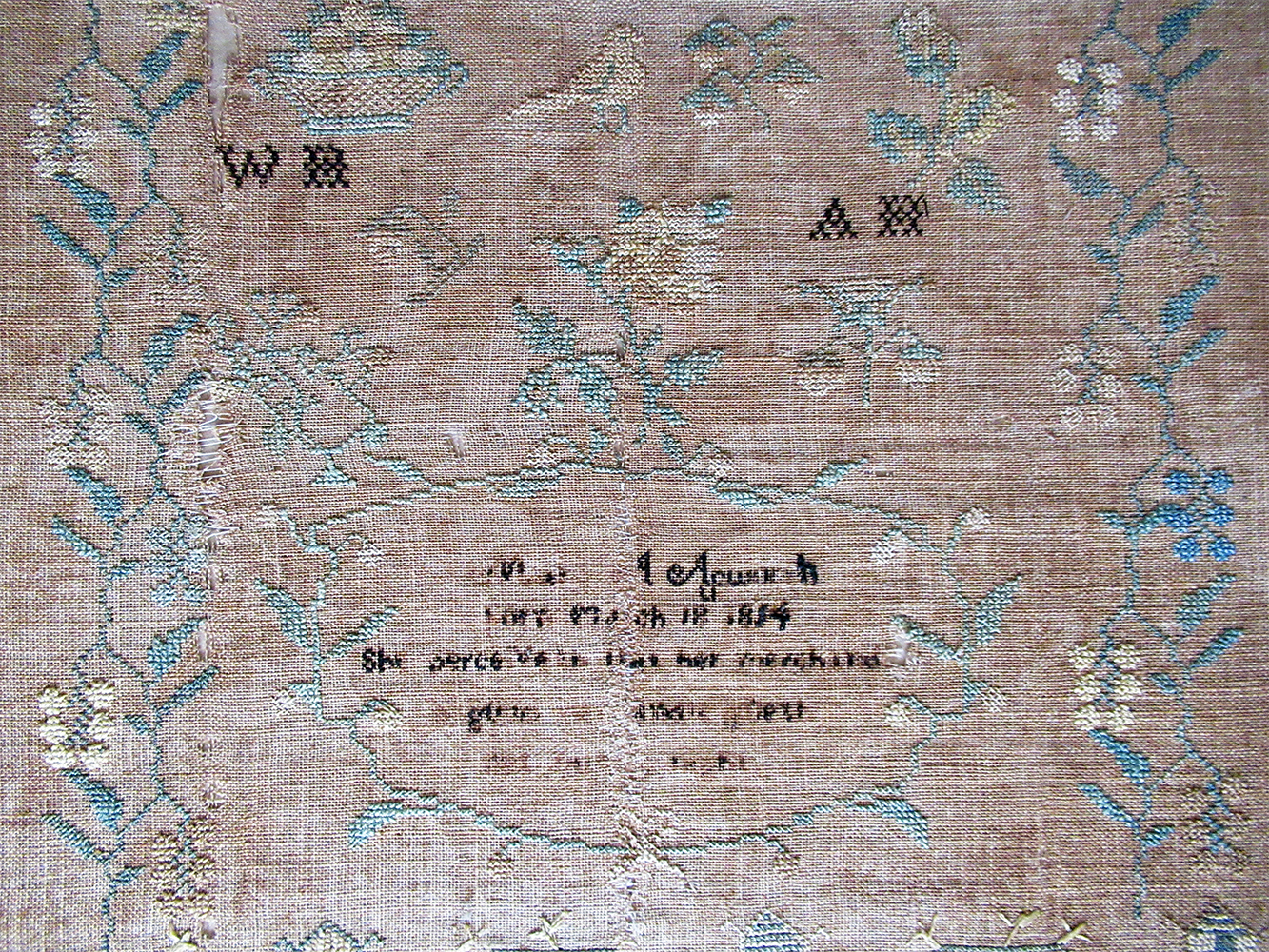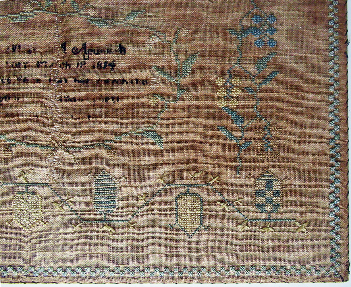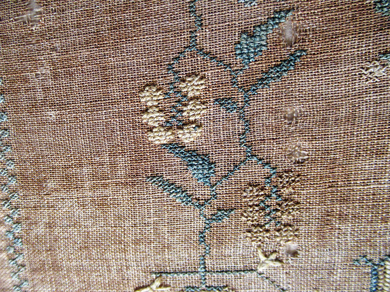 There is damage along the vertical center line, most likely from the sampler having been stored folded for many years, along with other holes and weak areas. Mounting onto a similar linen would disguise the holes. The brown linen is similar to what we now call “dirty linen” and is not very common in old samplers. Color retention of the silk is very good, although the brown linen makes the colors appear more muted than a lighter ground fabric would.