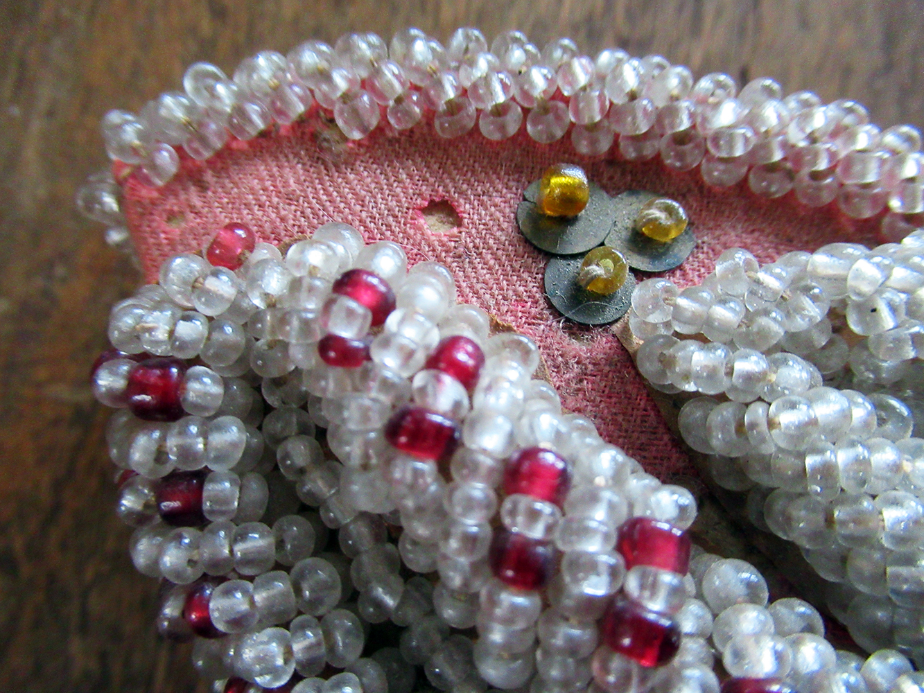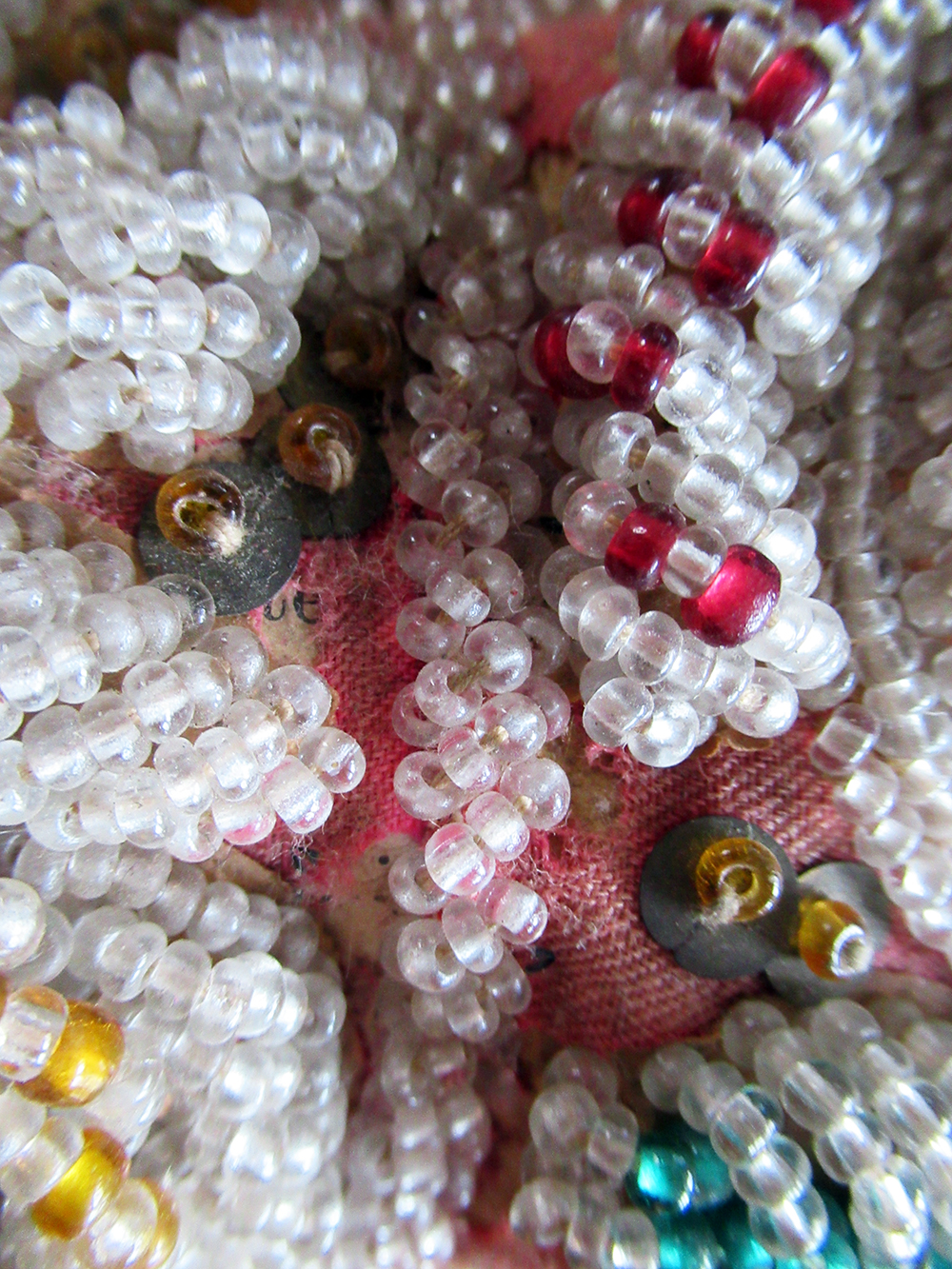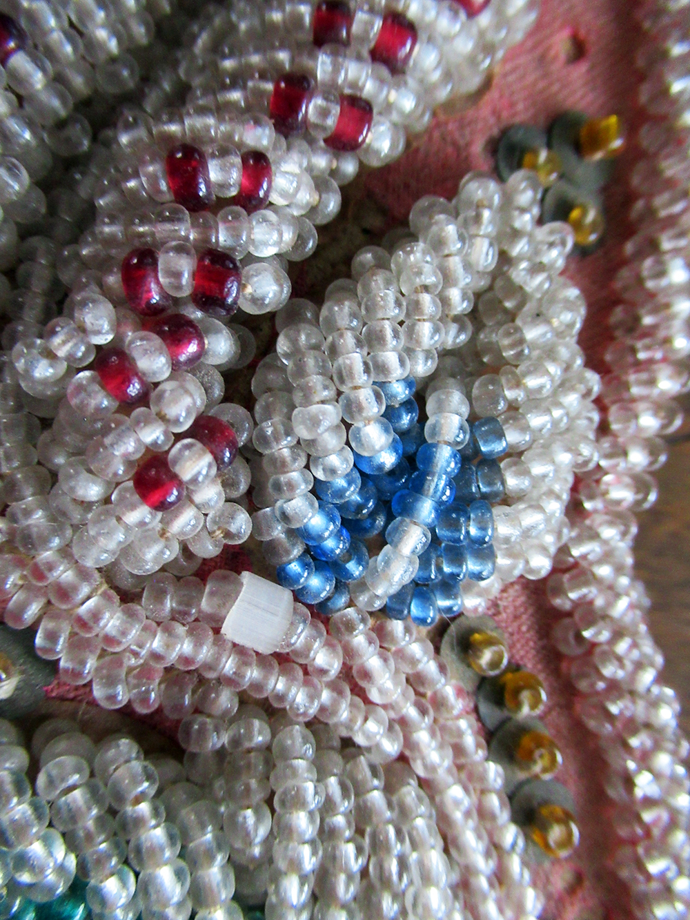 Condition is very good; the beadwork is in excellent condition with no missing beads. There are numerous small moth holes in the wool fabric but overall it is very sturdy.