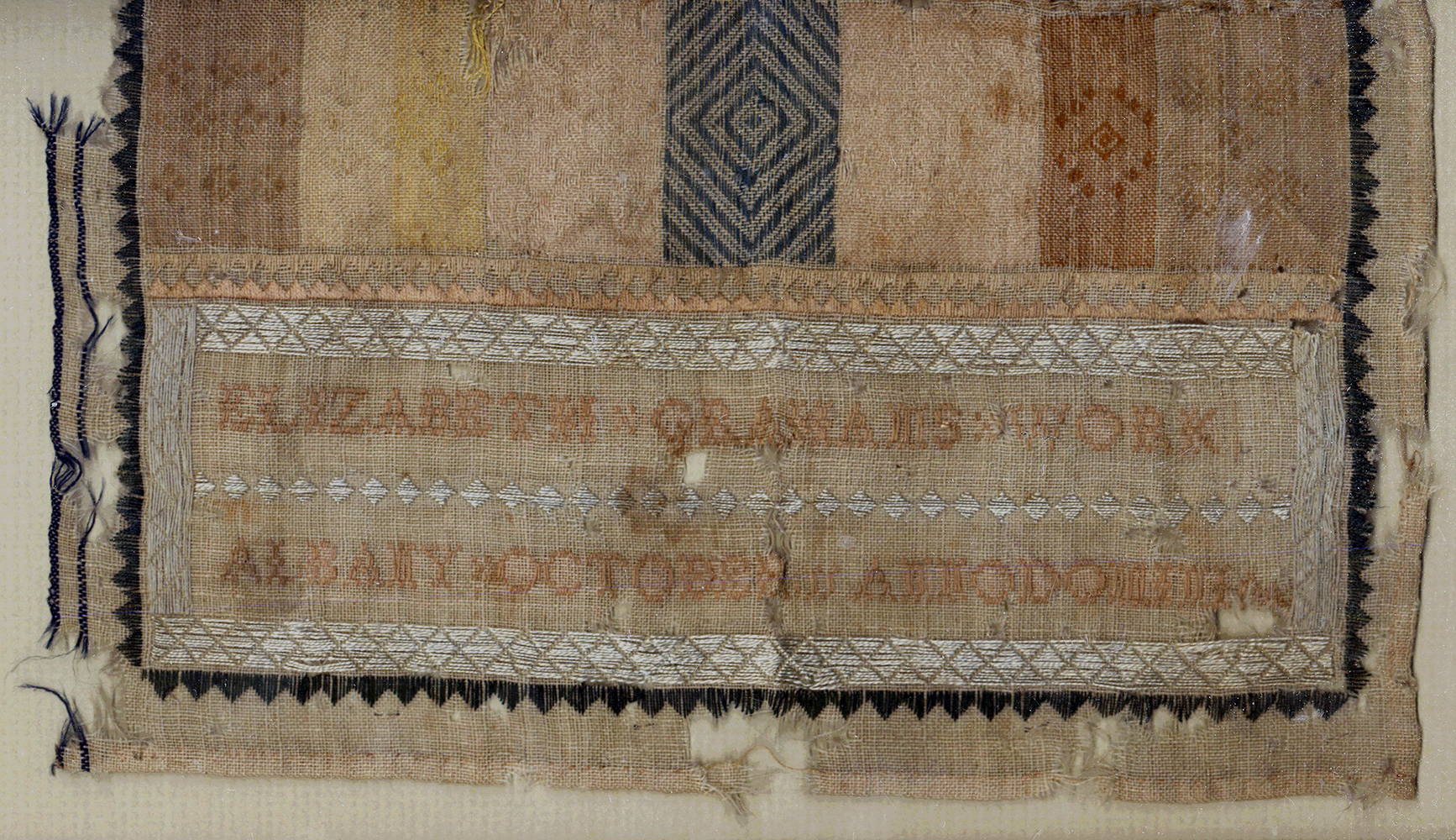 The inscription at the bottom reads Elizabeth Grahams Work Albany October 11 Anno Domini 1–0, with the date partially missing. The silk threads still show a wide variety of colors although they have softened with age and are now muted. The first two images are truest for color; the closeup images are scans and while they are darker than the sampler actually is they show the details better.