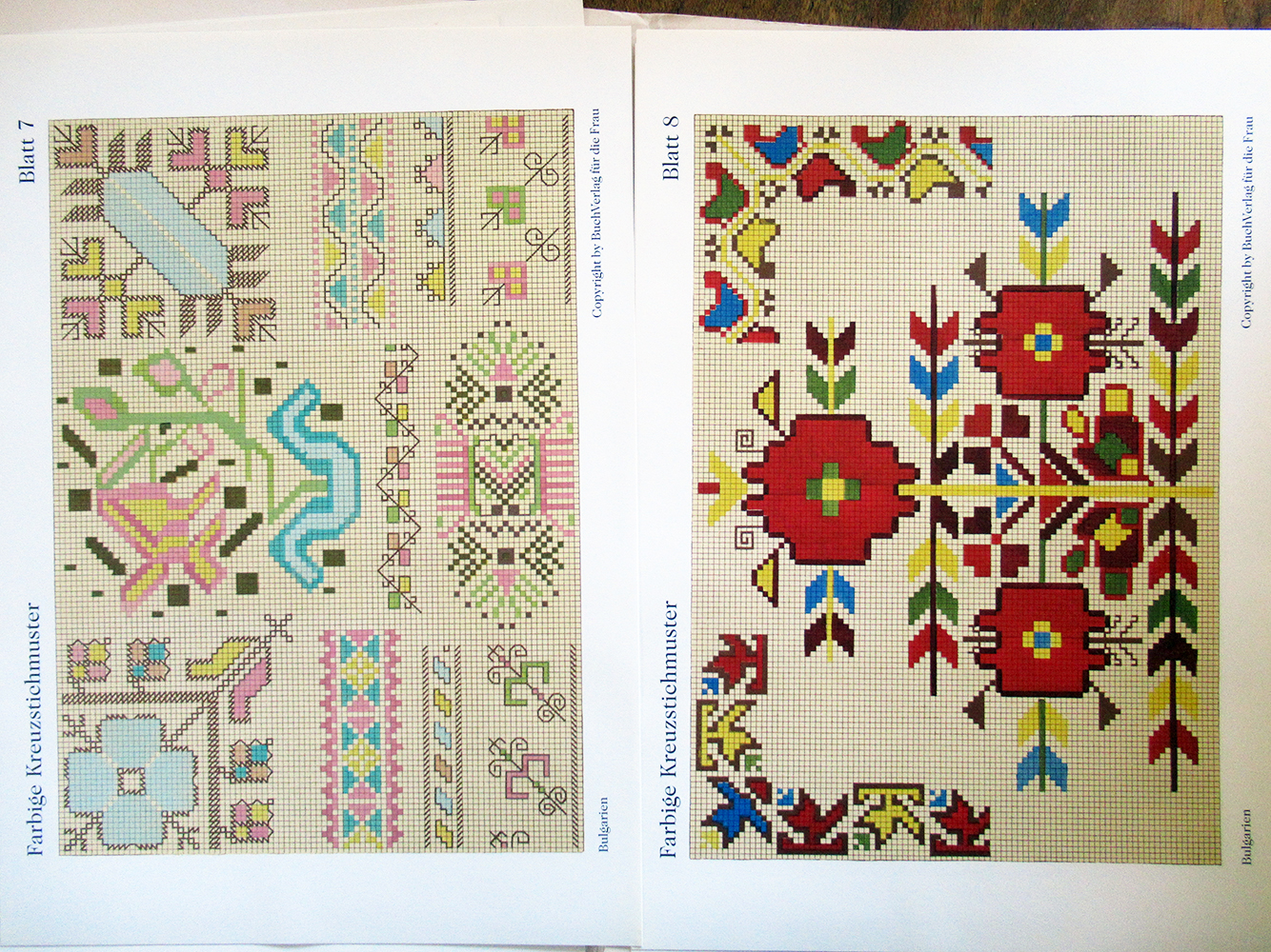 1998 German publication of historic cross-stitch charts of sampler motifs. Oversize at 10-1/4″ by 14-1/2″ inches. Portfolio contains 20 pages on heavy paper stock; 1 page of German language text and 19 polychrome charted patterns. Very nicely done with some minor color registration issues in the printing, many lovely charts.