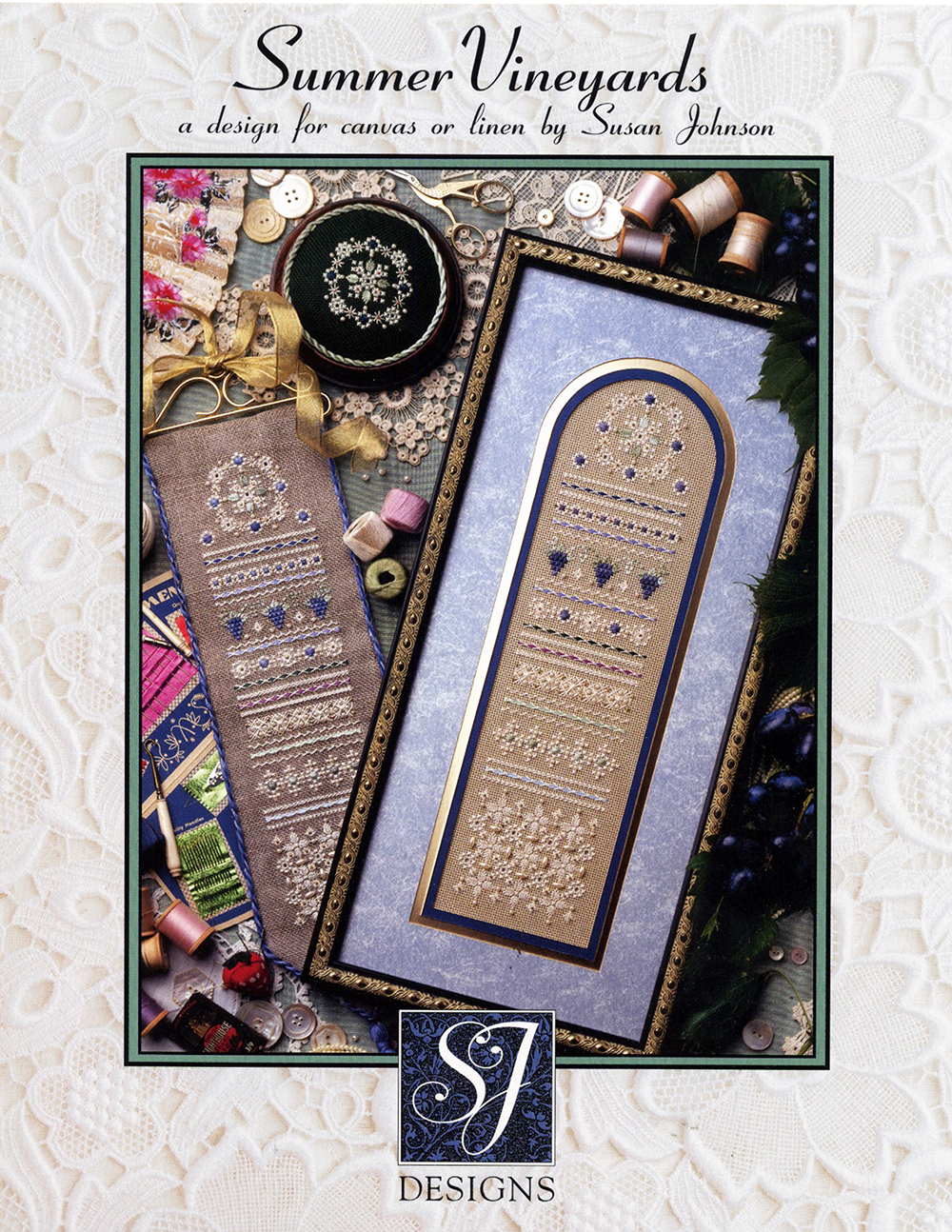 Zweigart Sandstone #18 mono canvas, cut 9” by 18” (22.5 by 45cm) was used for the framed picture. Brown canvas is also lovely. 18 count Wichelt natural brown linen was used for the bellpull, also cut 9” by 18”. Do not substitute 36-count linen since this sampler is designed to be worked over one thread of the fabric, and the ribbons and pearls will be too large in proportion to the stitches on a finer count fabric.